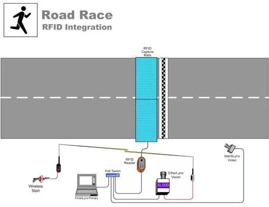 图8 终点电子计时摄像图片(图片来自菲普莱体育) 终点电子计时摄像是田径场内的径赛计时最为广泛采用的方法,但是需要人工辅助识别每个运动员。 射频识别计时技术——类似条形扫码的计时技术 射频识别计时RFID(Radio Frequency Identification)技术适用于长距离比赛的计时和记圈的系统,特别是成千上万名运动员参赛时,射频识别计时技术的优势十分明显。运动员携带不影响竞技状态的无源无线RFID感应器通过设置在起跑线上的射频识别天线阵列时,感应器向阅读器发出对应于每一个运动员的信息特征码,该运动员的信息特征码被数据处理系统处理并记录,实现自动计时和自动记圈的功能。