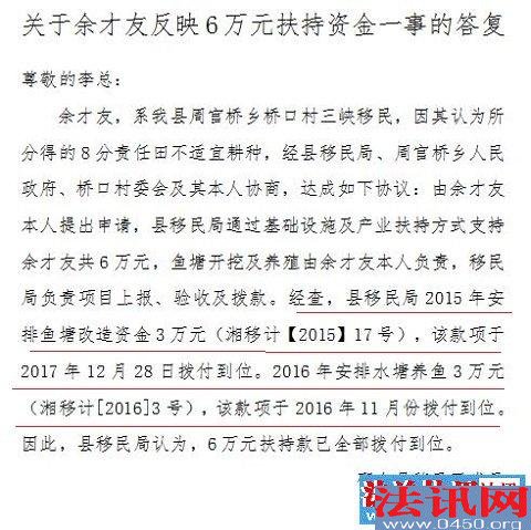 | 湖南邵东移民局克扣移民扶持资金:答复竟指鹿为马 独立撰稿人 李堂平 5月20日,法讯网发布《湖南邵阳市邵东县移民局克扣移民改造资金》,之后搜狐、凤凰网等几十家网站转发,引起强烈反响。邵东县移民局答复撰稿人,竟自相矛盾,指鹿为马! 克扣资金,邵东移民局回复矛盾重重 5月21日9时许,邵东县移民局办公室主任吴景军来电,吴说他(余才友)重复上访一二十次了,无理取闹,已经拨付了6万元,鱼塘改造3万元、鱼苗费3万元。对于协议不是移民局签写的,但承认盖章了是盖在上面的右上角的。撰稿人说这确认说不通,他称协议时他在场,当时在乡党委会议室就这么答复的。他(余才友)咬文嚼字,到市省移民局去,我们也这样答复的。对于上报材料没有时间金额太大等问题是村里笔误,这个是小事,我们去验收了,没有问题。对于和余才友签订的6万元补偿意见,吴说这个协议和开会时说的不一样,当时还发了脾气的“这是假的了!”。对于会议记录和移民局盖章的处理意见明确的写着“鱼塘改造资金6万元,及时验收拨付”,他笑着说这个没错,已经给了3万元和养鱼3万元。对于撰稿人说的是否偷换概念还是你们另外获取资金,这个就说不清了。吴答复:开会时我在场,资金我很清楚,这个绝对不是我们移民局写的。对于移民局盖的章,他说“我也不清楚,当时移民局赵岳军同志也不在场。”对于撰稿人说到会议记录和处理意见内容一致,书面承诺的东西不算数问题对方可以起诉,吴景军当即说道,这样我把资金拨付情况这些写给你个人,撰稿人告诉了QQ号,之后结束通话。 5月22日发来的答复 草鱼苗是2017年11月17日拨付,并非答复的2016年11月拨付到位 ![]() 会议记录和处理意见,并非吴景军说的不一样 ![]() 总造价12万元(又写成12元,这工作态度真不敢恭维!)的余才友新建鱼塘项目验收申请及工程移交书 ![]() 这笔款的批文湘移计【2015】6号比移民局答复的已经给付了3万元批复(湘移计【2015】17号)的还早,但余才友却没有领到这6万元 仔细查看内容,早前曝光的那总造价6万元的项目是“5亩鱼塘清淤加固”,而这个总造价12万元的项目是“鱼塘新建养殖”(鱼塘开挖、硬化、水管铺设),对比“田不能耕作改造成鱼塘,移民局扶持余才友资金6万元,及时验收付款”的处理意见,此上报的总造价12万元验收并合格的“鱼塘养殖新建”项目才是邵东县移民局纪委书记赵岳军和办公室主任吴景军出面协调处理的那6万元扶持资金!但这6万元去哪里了呢? 据了解,余才友共有4口鱼塘近10亩。明明是其他项目的扶持资金,为什么邵东移民局答复已经分二次拨付给余才友了呢?余才友的鱼塘项目重复上报并拨款,但移民余才友并没有领到属于自己的扶持款,邵东移民局是否存在贪占谋私呢?看看下面的一些事实就能知晓一二。 移民找局长李桃查看现场被打伤 |
