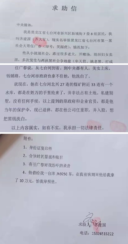 黑龙江省七台河市涉黑大哥任广春及其保护伞何时处理? 法讯网供稿人 纪奎权 黑龙江省七台河市有一黑社会“大哥”任广春,多年来通过各种非法手段攫取财富,并勾结政府干部做为保护伞,成为当地一霸,人称“笑面虎”。 该市新兴区新城街7委8组居民齐建国,曾在任广春手下多年,对其一系列恶行了如指掌,并且幡然悔悟,予以揭发。 齐建国说,任广春对当地的出租车、大型车辆等收取“保护费”,原市委秘书长(曾任运管处处长)宋国良及收费处处长李永发为其保护伞,只要提到任广春之名就放车。任广春还殴打多名执法交警,其中一名交警被打瞎一只眼睛,而李永发却出面摆平了此事。任广春在公安部门也有保护伞,如桃山区公安分局局长李盛录、原市公安局局长李伟东等。任广春曾送给李盛录一块黑色雷达表,送给李伟东两箱中华牌香烟和20万元现金。这两次行贿齐建国均在场。 任广春还组织妇女卖淫,被公安局周德威抓获后,交了1万元罚款了事,扣留的9个人全部释放。 齐建国还说,1997年,他与任广春合伙开煤矿,承包东风煤矿服务公司五井。这期间,任广春结识了原服务公司经理吴启山、原运销处储运处处长曲乃仁、原煤炭局局长徐大林,这些人都成了任广春的保护伞。任广春和齐建国的煤矿每出一吨煤要给曲乃仁提5元钱(当时每吨煤的售价为55元),逢年过节还要送上几万元的物品。在这些人的纵容下,任广春和齐建国每月往煤里掺几千吨岩石粉,严重地损害了国家的利益,而个人却攫取了不斐的财富。 任广春要盗采国矿的保安煤柱(用于保证不塌顶的煤柱),齐建国不同意,任广春就用恐吓、威胁的手段迫使齐建国退出而不退钱,说谁挡他财路就让谁死。齐建国退出后,任广春伙同吴启山、徐大林等人盗采保安煤柱,多次酿成矿难并且瞒报。2007年,任广春的昌隆煤矿发生瓦斯爆炸,死了17个人,该煤矿却一直生产至今。 齐建国说,他在前面提到的那些充当任广春违法犯罪保护伞的人现在均已退休,并在任广春的公司任职且有股份,借此将黑钱洗白。 任广春还叫嚣说,他在黑龙江省、七台河市和中央都有人,美女上床钱铺路,七台河市政府也拿不住他。 在中央全力打黑除恶的今天,任广春这样的黑社会人物还能在七台河大行其道,其背后的保护伞不可小视。七台河市委、市政府应该对任广春及其保护伞认真查处,严厉惩治,还人民群众一个温馨、祥和的生活环境。 |
