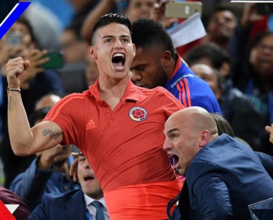 而到了双方公布首发阵容,J罗没有出现在首发之中,也不在替补名单。比赛一开始,他和自己队友一起来到球场,在工作人员指引下走上看台。比赛第22分钟,哥伦比亚进攻,夸德拉多获得好机会,但是他的大力抽射被对方球员挡出,莫西卡跟进射门又打偏,看台上的J罗捂着嘴跟同在看台的队友进行交流,似乎是评价夸德拉多的射门。与此同时,J罗后排一位亚洲面孔的美女球迷,含情脉脉的盯着J罗看了好几眼。
