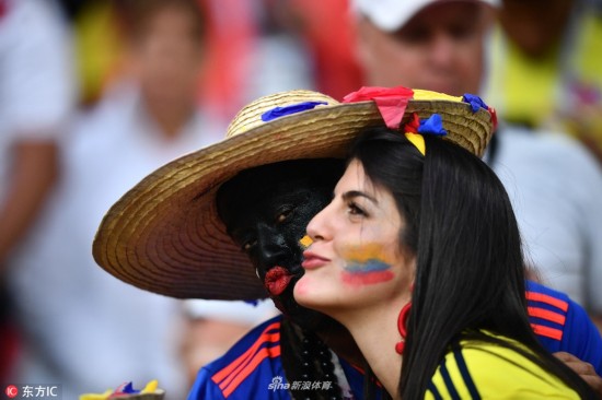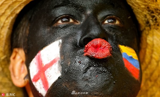 当地时间2018年7月3日,俄罗斯莫斯科,2018世界杯1/8决赛,哥伦比亚VS英格兰。哥伦比亚“大黑脸”球迷嘟嘴送飞吻