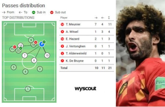 费莱尼出场后的站位和传接球数据 从Wyscout的技术统计可以看到,费莱尼直接顶到一个前腰的位置。这样的做法,其实目的是要增加阵地战时,球队在禁区内的兵力。可以看到的是,费莱尼一共接应到了10次队友的传球,其中7次来自于右翼卫穆尼耶,2次来自于阿扎尔,目的就是他能完成头球攻门。
