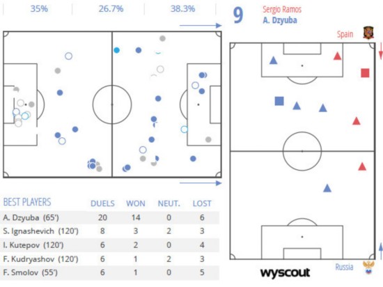 左图为俄罗斯争高数据,右图路为久巴对抗拉莫斯的数据 从Wyscout的技术统计可以看到,本场比赛中,俄罗斯一共尝试了61次的高空球争夺,其中将近3分之一,也就是20次的高球争夺来自于久巴。他赢下了其中的14次,有着高达7成的成功率。从右图上我们可以看到,久巴在与拉莫斯的一对一对抗中,赢下了靠近中路的5次。只有在去到边路位置,拉莫斯方才赢下4次。他在中路的战术价值之大,是俄罗斯可以扛住比赛前半段的关键原因。
