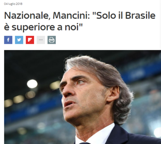 《天空电视台》在意大利的子公司电视台5频道采访了意大利国家队主教练曼奇尼,曼奇尼在观看了到目前为止的比赛后表示,“这次世界杯上,除了巴西之外,没觉得其他球队比意大利强。”