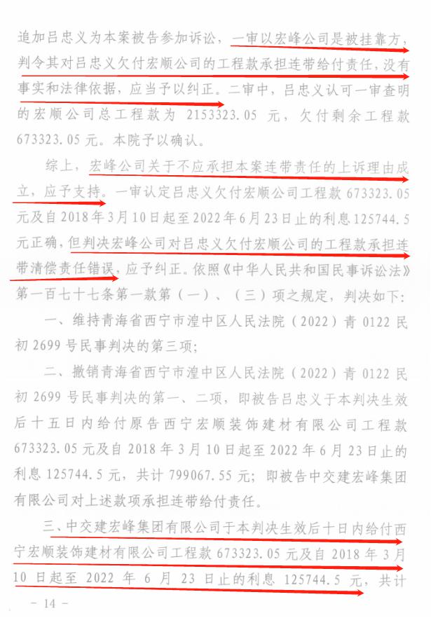 | 让人大跌眼镜的二审判决 事情经过: 2016年3月15日,宏峰公司中标案涉项目,进场施工时候遇到重重困难,无奈之下,同年4月27日,宏峰公司将案涉工程全部转包给吕忠义实际施工。2016年8月18日,建设方将施工合同内容中的装饰和安装工程另做统一安排。即:该项目的装饰和安装工程全部由建设方统一另行采购材料,选择专业施工队伍进行施工,宏峰建设集团配合施工。也就是宏峰公司转包给吕忠义的工程量里面已经不包括案涉防火卷门部分。 2018年10月25日,吕忠义完成案涉项目全部施工并审计结算完毕,审定金额为114758171.41元,2019年5月31日,吕忠义与宏峰公司完成结算,并签字确认从宏峰公司处领到全部工程款114758171.41元,已经与宏峰公司结清全部款项,宏峰公司没有欠款未付情况。 2016年9月30日,吕忠义以个人名义与被上诉人宏顺公司签订了案涉《防火卷帘工程施工承包协议》,该协议没有加盖宏峰公司任何印章。为了针对现场安全管理问题,在签订了案涉《防火卷帘工程施工承包协议》后,吕忠义个人又与案外人签订了案涉《安全补充协议》,宏顺公司并不是该《安全补充协议书》中任何一方当事人。 2022年6月13日,宏顺公司以与宏峰公司存在合同关系为由向青海省西宁市湟中区人民法院提起诉讼。 2022年8月16日,宏顺公司以要与吕忠义进行工程结算为由向湟中区人民法院提交《延期开庭申请书》,2022年 11月8日湟中区法院作出(2022)青0122民初2699号民事判决书,认定被告宏峰公司与吕忠义实际为挂靠关系,且被告吕忠义从事的是被告宏峰公司承包建设的项目,故被告宏峰公司对原告的工程款应承担连带支付责任。判决:一、被告吕忠义于本判决生效后十五日内给付原告西宁宏顺饰建材有限公司工程款673323.05元及自2018年3月10日起2022年6月23日止的利息125744.5元,共计799067.55元;二、被告中交建宏峰集团有限公司对上述款项承担连带给付责任;三、建设方不承担给付责任。 宏峰公司不服一审判决结果,向西宁市中级人法院提起上诉,西宁中院的刘红法官于2023年3月22日组织开庭询问,后于3月27日作出(2023)青01民终75号民事判决书,认定吕忠义未以宏峰公司的名义与宏顺公司签订《工程施工承包协议》,宏峰公司关于不应当承担本案连带责任的上诉理由成立,应予维持。一审认定吕忠义欠付宏顺公司工程款673323.05元及自2018年3月10日起至2022年6月23日止的利息125744.5元正确。但判决宏峰公司对吕忠义欠付宏顺公司的工程款承担连带清偿责任错误,应予以纠正。根据《民事诉讼法》第一百七十七条第一款第(一)、(三)项之规定,判决如下:一、维持青海省西宁市湟中区人民法院(2022)青 0122 民初2699号民事判决的第三项;二、撤销青海省西宁市湟中区人民法院(2022)青0122民初2699号民事判决的第一、二项,即被告吕忠义于本判决生效后十五日内给付原告西宁宏顺装饰建材有限公司工程款673323.05元及自2018年3月10日起至2022年6月23日止的利息125744.5元,共计799067.55元;即被告中交建宏峰集团有限公司对上述款项承担连带给付责任。三、中交建宏峰集团有限公司于本判决生效后十日内给付西宁宏顺装饰建材有限公司工程款673323.05元及自2018年3月10日起至2022年6月23日止的利息125744.5元,共计799067元。如果未按本判决指定的期间履行给付金钱义务,应当加倍支付迟延履行期间的债务利息,一审案件受理费12149元和二审案件受理费11627元由宏峰公司承担。 一审判决只是连带责任,宏峰公司上诉后,二审法院看似支持了宏峰公司的上诉请求,却让宏峰公司得到了比一审判决更严重的法律后果,并且没有给出任何说理和依据的法律条款,如此急速反转,让宏峰公司哭笑不得,大跌眼镜,也百思不得其解,多次联系合议庭判后答疑,经办人刘红法官休假,由审判长进行了接待并做了答疑,审判长在了解案件后,也意识到该判决结果存在问题,但却因判决已经下发,其无权更正为由,让宏峰公司申请再审。求问广大网友,遇到如此奇葩的判决结果宏峰公司应该怎么办? |