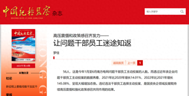今年1月至6月,南方电网共有56名问题干部员工主动投案。 最新一期《中国纪检监察》杂志刊发《高压震慑和政策感召齐发力—— 让问题干部员工迷途知返》。 文章披露,高压震慑之下,2022年4月24日,南方电网所属某二级单位副总经理刘某到南方电网纪检监察组主动投案。 全文如下。 56人,这是今年1月至6月南方电网问题干部员工主动投案的人数。而透过近年该企业问题干部员工主动投案的数据再看,2021年比2020年增长14.01%,2022年比2021年增长145.08%,呈现大幅增加态势。违纪违法干部员工选择主动投案,是国资央企领域反腐败持续高压震慑和强化政策感召共同作用的结果。 惩前毖后、治病救人”的方针,讲清“四种形态”以及事实和纪法是定量、态度是变量的关系,阐明主动投案与被动查处、积极配合与对抗审查、主动退赃与隐瞒转移的区别,让问题干部员工明白“主动与不主动,结果大不一样”。 政策宣讲不是空洞的,而是用事实说话。前面提到的刘某,南方电网纪检监察组经过对其主动投案动机、时机、觉悟态度、如实供述、现实表现等因素进行综合考量后,对刘某立案审查调查,不采取留置措施。刘某在《忏悔反思》中写道:“我的主动投案得到了组织的肯定,本着治病救人的方针,对我进行了挽救……自己已经站在了悬崖边沿,前面就是万丈深渊,是组织把我从悬崖边沿拉回来……让我更加坚定要充分相信组织,信任组织,让我认错悔错改错。” 在极有温度的政策感召下,越来越多的问题干部员工选择相信组织、走向组织——参加教育挽救大会后,广东电网所属某单位干部陈某1主动向组织交代了收受管理和服务对象赠送的礼品问题;同样在警示教育大会后,海南电网某业务部门干部吴某主动向组织交代了其利用职务便利、为供应商谋取利益提供帮助并收受钱财的问题;贵州电网和所属单位开展警示教育期间,共有81人主动向组织说清问题,上缴违规违纪违法所得300余万元。 主动投案、主动交代,是组织给犯错党员干部一个改过自新的机会。但是,也有人不但不珍惜这个机会,还妄图以“投案”来“投机”、幻想着蒙混过关。实践中,南方电网纪检监察组认真贯彻中央纪委办公厅印发的《纪检监察机关处理主动投案问题的规定(试行)》,准确把握主动投案的内涵与要件,规范明确对主动投案、主动交代的认定和处理,认真审核把关,努力做到精准规范稳妥处置。对说小掩大、避重就轻,徒有投案之名,却无交代之实等企图蒙混过关的,依规依纪依法从重或加重处理。 迷途知返,拉上一把;不知悔改,严惩不贷。在查办一起案件中,南方电网纪检监察组发现了党组管理干部郭可青的问题线索。因有自己的关系人涉案而惶恐的郭可青,多次到南方电网纪检监察组,以说明问题为由,行投石问路之实,对组织晓之以理、动之以情的谈话置若罔闻;其被留置后,仍抱着与他人已订立攻守同盟的幻想,拒不交代问题,结果自作自受,被判处有期徒刑19年,并处罚金700万元。 无独有偶,广东电网所属某单位干部陈某2,在教育挽救大会后主动交代了收受管理和服务对象赠送的礼品礼金问题,并主动上缴违纪所得。基于陈某2未如实交代全面问题的研判,组织多次与其谈话,讲政策讲出路,但陈某2在首次谈话中故意隐瞒事实真相,编造虚假信息;在第二次谈话中,对违纪事实拒不承认,并与多人进行串供、订立攻守同盟,对抗组织审查。经查,陈某2的违纪所得超过其主动交代的金额,而且还存在其他违纪问题。最终,陈某2受到开除党籍、行政开除处分。 “坚持一体推进不敢腐、不能腐、不想腐,是取得更大反腐治理成效的重要法宝。”南方电网纪检监察组有关同志表示,企业将继续保持高压震慑、强化政策感召,让有问题的干部员工尽早迷途知返,走到主动投案、主动交代这条正确道路上来。 在教育挽救大会后主动交代了收受管理和服务对象赠送的礼品礼金问题,并主动上缴违纪所得。基于陈某2未如实交代全面问题的研判,组织多次与其谈话,讲政策讲出路,但陈某2在首次谈话中故意隐瞒事实真相,编造虚假信息;在第二次谈话中,对违纪事实拒不承认,并与多人进行串供、订立攻守同盟,对抗组织审查。经查,陈某2的违纪所得超过其主动交代的金额,而且还存在其他违纪问题。最终,陈某2受到开除党籍、行政开除处分。 “坚持一体推进不敢腐、不能腐、不想腐,是取得更大反腐治理成效的重要法宝。”南方电网纪检监察组有关同志表示,企业将继续保持高压震慑、强化政策感召,让有问题的干部员工尽早迷途知返,走到主动投案、主动交代这条正确道路上来。 《中国纪检监察》点评:国资央企问题干部员工主动投案越来越多的现象背后,是该领域反腐力度的持续加大,以及对全面从严治党政策策略的有效运用。惩前毖后、治病救人是我们党的一贯方针,有关党规党纪和监察法也明确,对于主动投案、主动交代问题、主动认罪认罚等情形,可给予从轻减轻处理。天网恢恢、疏而不漏,在我们党“反腐败斗争一刻不能停,必须永远吹冲锋号”的坚定决心之下,在只会持续保持的高压惩治态势面前,不管是国资央企领域,还是其他领域的问题干部,心存侥幸无出路,迷途知返是正途。对于已步入歧途的违纪违法干部而言,认清形势、尽早回头,相信组织、珍惜机会,怀着对党的忠诚、对党纪国法的敬畏之心,主动