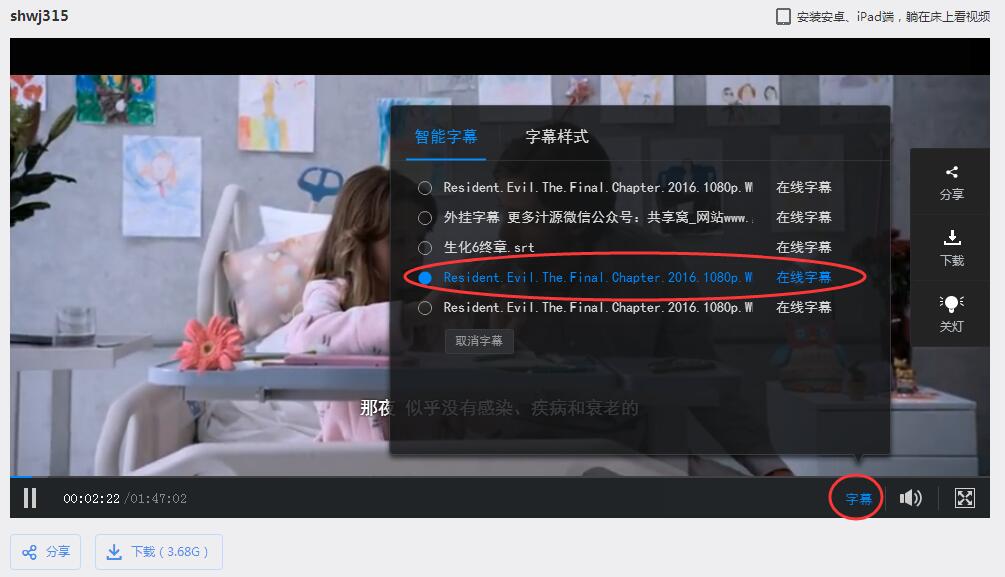 百度网盘 - 右下角 - 字幕 倒数第二个匹配得比较精准!