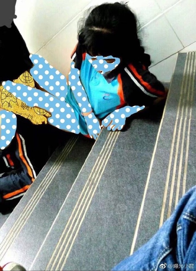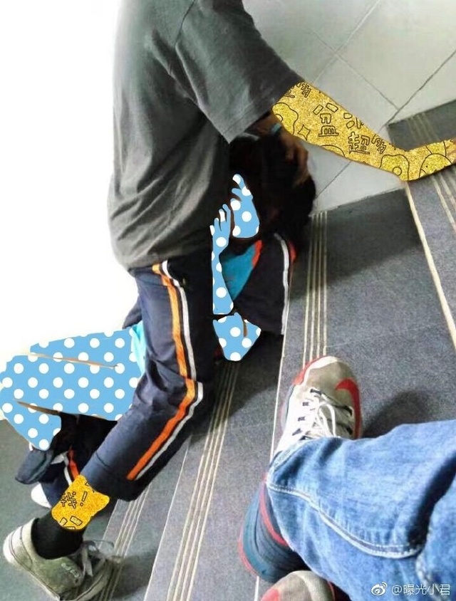 照片中,疑似一男一女两名学生在楼梯上做出不雅动作,现场还有第三人。