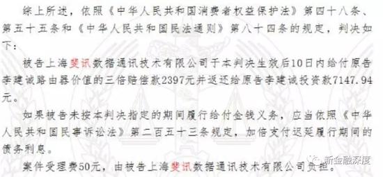 最后招远法院判定上海斐讯数据通讯技术有限公司于本判决生效后10日内给付该投资人路由器价值的三倍赔偿款并返还给该投资款数。