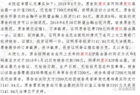 11月28日,山东招远法院发布的一份民事判决书也将斐讯与联璧金融之间的关系和盘托出。根据一位投资人提供信息,这位投资人在斐讯官网购得路由器一台价值799元,还包括了799元的K码,按照斐讯的0元购活动,这位投资人在金融平台联璧金融上投资了7147.94元,激活其K码,按其约定投资人的投资可以分期返还,但联璧金融出现问题后,致使无法提现。