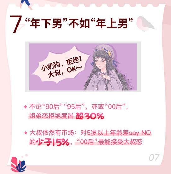 在年龄这一硬性指标下,女性对于“年上男”(男生年龄比女生大)的接受度普遍高于“年下男”(男生年龄比女生小,即姐弟恋),大叔明显比“小奶狗”有市场。报告显示,“90后”、“95后”、“00后”对于姐弟恋的拒绝度都超过30%,但对于年龄比自己大5岁以上的“大叔型年上男”,仅有不到15%的女性表示不能接受。一位出生于1997年的女读者明确表示,“就算大我十岁我们也能谈天说地,可即便只比我小半个月,那大家隔的就是个银河系,肯定没办法在一起。”