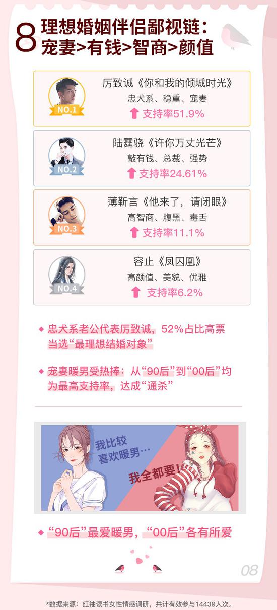 尽管颜值在恋爱中极具竞争力,但在婚姻的场景里,颜值身价实在是低到尘埃里。报告以网络文学作品中的“国民老公”为标准,选出忠犬暖男系、霸道总裁系、高智商腹黑系、高颜值美男系这具有代表性的四大类型,并从中调研女性理想的婚姻伴侣。