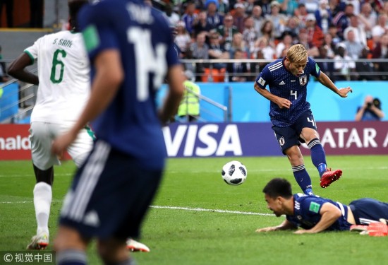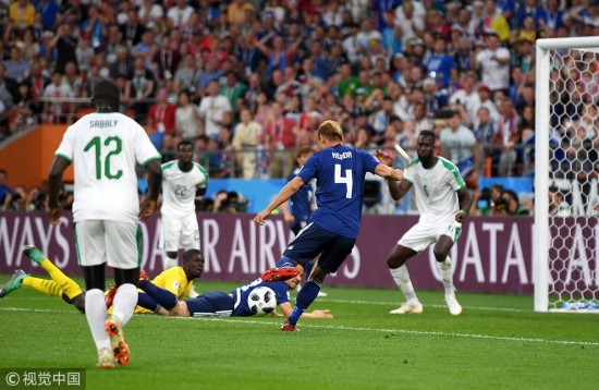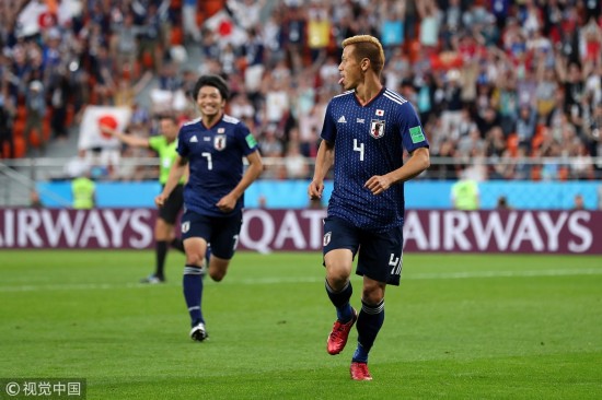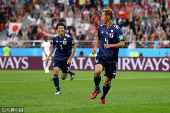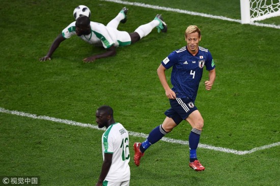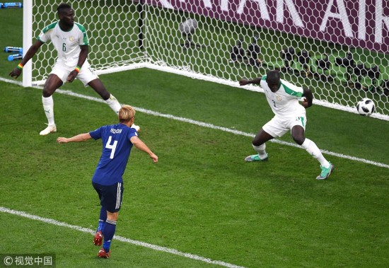 北京时间6月24日,世界杯H组小组赛,日本vs塞内加尔,比赛第78分钟,日本球员本田圭佑和队友配合,最后本田圭佑门前将球推射入网。