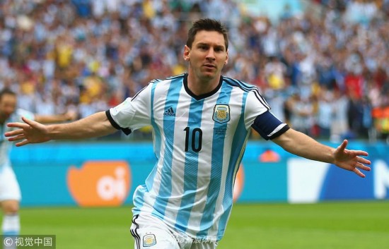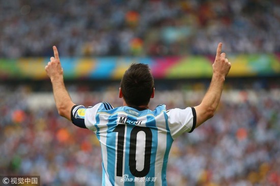 2014年6月25日,巴西贝拉里奥球场,2014巴西世界杯小组赛F组,尼日利亚Vs阿根廷。 梅西在打入球队首粒进球后庆祝