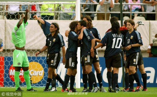 2002年6月2日,韩国釜山,2002韩日世界杯小组赛,阿根廷Vs尼日利亚。 阿根廷队员庆贺胜利。