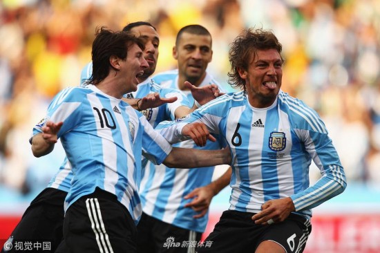 2010年6月12日,南非约翰内斯堡,2010世界杯B组小组赛,阿根廷Vs尼日利亚。海因策与队友庆祝进球。