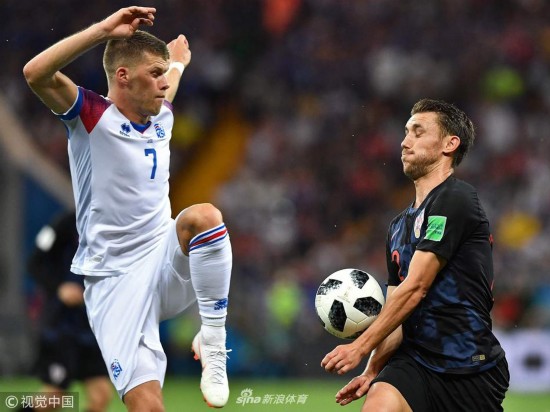 2018年6月26日,俄罗斯,2018俄罗斯世界杯小组赛D组,冰岛1-2克罗地亚。 Iceland\'s midfielder Johann Gudmundsson (L) vies with Croatia\'s defender Josip Pivaric during the Russia 2018 World Cup Group D football match between Iceland and Croatia at the Rostov Arena in Rostov-On-Don on June 26, 2018. RESTRICTED TO EDITORIAL USE - NO MOBILE PUSH ALERTS/DOWNLOADS JOE KLAMAR / RESTRICTED TO EDITORIAL USE - NO MOBILE PUSH ALERTS/DOWNLOADS