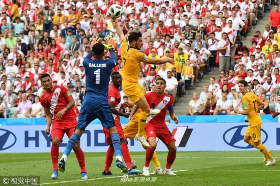 2018年6月26日,俄罗斯索契,2018俄罗斯世界杯小组赛C组,澳大利亚0-2秘鲁。 Australia\'s forward Mathew Leckie (L) jumps for the ball next to Peru\'s goalkeeper Pedro Gallese during the Russia 2018 World Cup Group C football match between Australia and Peru at the Fisht Stadium in Sochi on June 26, 2018. RESTRICTED TO EDITORIAL USE - NO MOBILE PUSH ALERTS/DOWNLOADS Odd ANDERSEN / RESTRICTED TO EDITORIAL USE - NO MOBILE PUSH ALERTS/DOWNLOADS