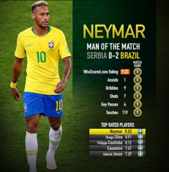末战塞尔维亚是巴西的出线生死战,内马尔两次获得破门良机,可惜与上轮对垒纳瓦斯时情况类似,射门均被对手门将斯托伊科维奇奋勇扑出。不过内少还是通过角球传中助攻蒂亚戈-席尔瓦破门,两位巴黎圣日耳曼队友上轮曾发生摩擦,席尔瓦将球踢出界让对方疗伤,结果遭内少怒吼,巴西中卫顿感委屈,还将此事捅给媒体,这次进球配合后两人拥抱庆祝,应能解开心结化解矛盾。