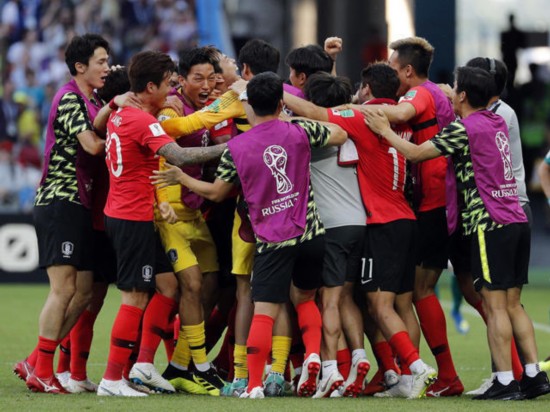 韩国队球员庆祝进球 韩国队的球迷们已经对他们被淘汰丝毫不在意,他们只在意的是他们赢了强大的德国队。一个韩国球迷在韩国最大的网站“NAVER”上写道,“这是韩国队自2002年世界杯之后打的最好的一场比赛了!”这个帖子得到了成千上万个赞。 是申台龙的大胆用人、球员们的勇气和奉献精神赢下了这场比赛。但是现在,对于申台龙是走是留还不确定,而且是否孙兴慜会免去服兵役呢?目前尚需时日等待这两个关键问题的答案。 与此同时,这是最近80年来德国队第一次小组赛即被淘汰,德国媒体称这场失利是一个“灾难”,勒夫的领导能力受到了全德国人的质疑。如果勒夫在这场与韩国队的比赛之后下课也不足为奇。 最后,用德国中后卫胡梅尔斯的话来总结这场比赛,“这是我职业生涯最失望的一场比赛!”返回腾讯网首页>> |