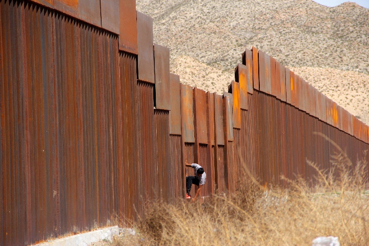 一名墨西哥青年试图翻越美墨隔离墙。(新华社/法新)